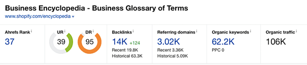 Begrip definities zijn ook effectief voor externe linkbuilding. Degenen die een autoriteitsbron moeten citeren om een e-commerceterm te definiëren, kunnen de woordenlijst van Shopify gebruiken (zoals je kunt zien, heeft Shopify al 14.000 backlinks verdiend).